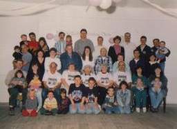 Eileen Doubleday's 80th Birthday (1996) FAMILY PICTURE AT THE 80TH BIRTHDAY, including Eileen, Brian, Pat, Jim, Betty Ann and all their families. Eileen's 10 grand children and 15 great grand children in 1996. There have been 9 more great grand children added since 1996. They celebrated their Mom's 90th birthday on May 7 2006. |